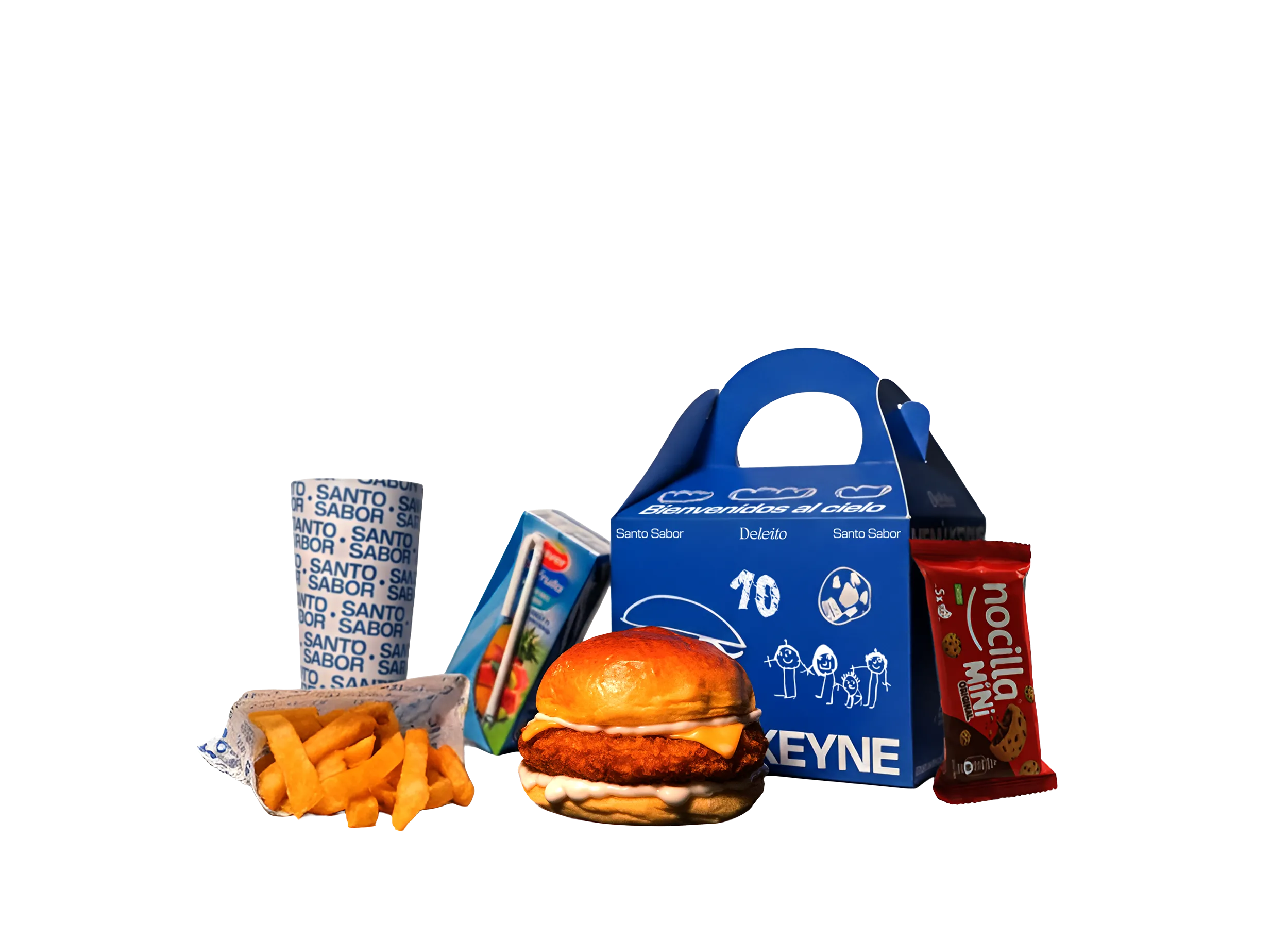 Keyne Cheeseburger o Keyne Pollo Crunchy, patatas, zumo, galletas Nocilla Mini Cookies Original y un vaso coleccionable de regalo